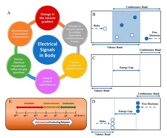 (A) Different electrical signals utilized in the body. Energy gap representations for (B) conductors, (C) insulators, (D) semiconductors, and (E) conductivity ranges for these material classifications compared to typical conducting/electroactive polymers.