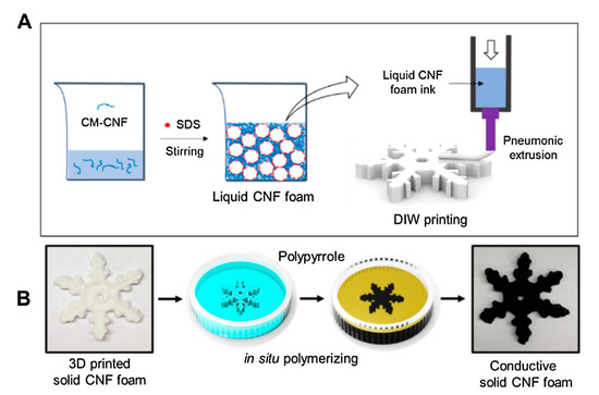 Procedure to prepare conductive solid cellulose nanofiber (CNF) foam-based 3-D materials [80]. (A) The liquid CNF foam ink is generated by stirring carboxymethylated (CM)-CNF suspension using sodium dodecyl sulfate (SDS) as an emulsifier to induce phase separation; (B) conductive foams are prepared through in situ polymerization of polypyrrole (PPy) on solid CNF foams. Adapted with permission from Elsevier, 2021.