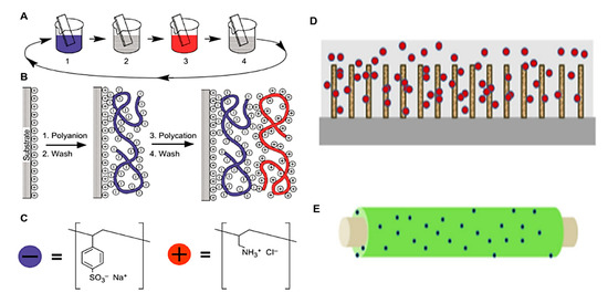 (A–C): Schematic of a layer-by-layer film coating procedure; steps 1 and 3 represent the adsorption of a polyanion and polycation, respectively, and steps 2 and 4 are washing steps [82]. (D,E): Examples of film casting and dip coating [4]: (D) cellulose cast from room temperature ionic liquids (spheres) onto multi-walled carbon nanotubes (cylinders) grown on silicon wafer; (E) dip-coating in lactose-modified chitosan and embedding Ag nanoparticles (spheres) on the thermoset core. (A–C) are reproduced with permission from Science, 1997. (D,E) are reproduced with permission from Elsevier, 2014.