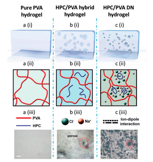 A diagram of three biopolymer-based hydrogels using embedding techniques [88]. (a) A pure hydrogel material of polyvinyl alcohol (PVA). (b) A hydroxypropyl cellulose (HPC) fiber embedded hydrogel (PVA + HPC). (c) A hydrogel embedded with ionically soaked fibrous materials (PVA + HPC + NaCl). Reproduced with permission from Wiley, 2018.