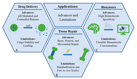 Advancements in biomaterial research are expanding into the clinic, generating novel therapies and technologies for disease management and treatment. With clinical applications in mind, the ideal biomaterial should be biodegradable and biocompatible. Additional factors for researchers to consider are biomaterial accessibility, conductivity, cytotoxicity, and reproducibility. Four common areas of application include nanomedicine, drug delivery, tissue regeneration and biosensors. Figure 7 presents a general summary for these applications.
