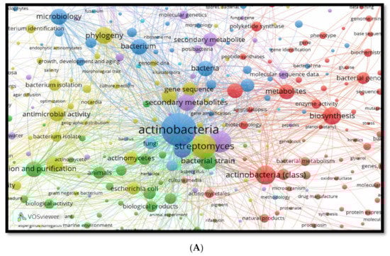 The majority of diversity keywords from the reviewed and cited papers based on the Scopus database were Streptomyces, Actinobacteria, natural products, primary, secondary metabolites, habitat effects of environments, pharmaceutical industry, as shown in Figure 2A.