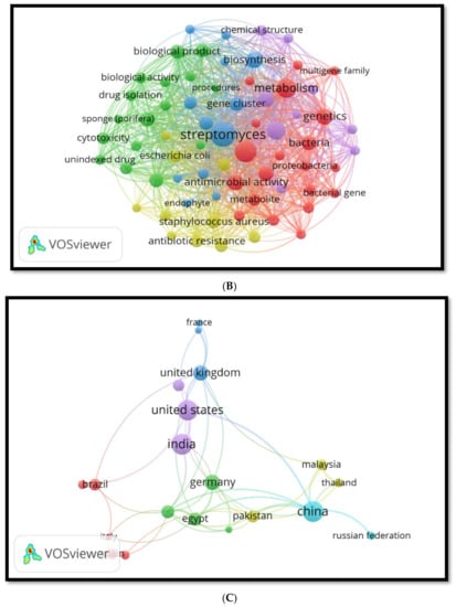 VOSviewer software tool to analyse and visualise scientific literature from 2010 to 2021 for phylum Actinobacteria. (A) Diversity of keywords from the Scopus database for Streptomyces, Actinobacteria, natural products, primary, secondary metabolites, habitat effects of environments, pharmaceutical industry; (B) Spread of reviewed and cited papers based on the dispersed keywords of anti-infective agents and occurrence. (C) The countries with the highest numbers of publication and citation. N.B: The name of countries in small letters from the VOSviewer software itself.
