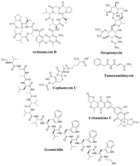 The genus Streptomyces is a Gram-positive bacteria. It is the largest genus of the phylum Actinobacteria, which has complex growth and can produce various secondary metabolites [8]. In addition, there are more than 800 Streptomyces species that have been found to date (see http://www.bacterio.net/Streptomyces.html (accessed on 20 August 2020) [9]. Streptomyces is the major microbial genus of the most antibiotic-producing bacteria in the microbial world discovered so far, where streptomycin, gentamycin, rifamycin, chloramphenicol and erythromycin are produced by Streptomyces [10].