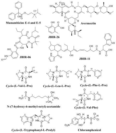 The molecular structure of Munumbicins E-4 and E-5; Avermectin; JBIR-06; JBIR-11; and JBIR-26. Cyclo-(L-Val-L-Pro), Cyclo-(L-Leu-L-Pro), Cyclo-(L-Phe-L-Pro), N-(7-Hydroxy-6-Methyl-Octyl)-Acetamide, Cyclo-(L-Val-L-Phe), Cyclo-(L-Tryptophanyl-L-Prolyl) and Chloramphenicol.