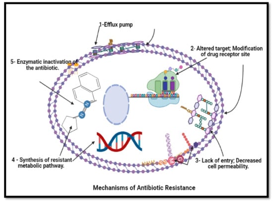 Furthermore, homogeneous tolerance is based on mutations at a different locus of genetics. Furthermore, other external and internal causes affect the development of methicillin resistance [115]. The mechanism of anti-bacterial resistance is demonstrated in Figure 6.