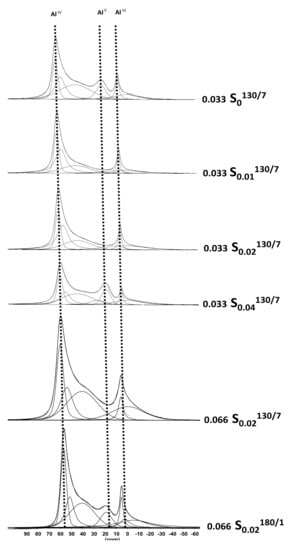27Al MAS-NMR is known to be applied to determine and quantify the different coordination states of this nucleus.27Al MAS-NMR spectra (Figure 4) of the synthesized MOR samples (0.033 S0130/7, 0.033 S0.01130/7, 0.033 S0.02130/7 and 0.033 S0.04130/7) show two or three signals. One is characteristic of the resonance of tetracoordinated aluminum atoms, another corresponds to the resonance of pentacoordinated aluminum atoms, and the other is characteristic of the resonance of hexacoordinated aluminum. The tetracoordinated aluminum atom AlIV resonates at a chemical shift of 54 ppm. The pentacoordinated aluminum atoms AlV resonate at a chemical shift of 12 ppm, and AlVI hexacoordinated aluminum atoms at a chemical shift around 0 ppm. The percentage of each aluminum species (AlIV as intra-framework and AlV and AlVI as extra-framework aluminum “EFAL”) is quantified by integrating the signals corresponding to each of these species. The quantitative analysis of each of these families by 27Al MAS-NMR combined with XRF results allows the calculation of the Si/Al ratio of the framework and to determine the number of extra framework aluminum “EFAL” per zeolite unit cell. The number of extra-framework Al atoms per unit cell seems to vary from 1 to 2, but seems not directly related to the CTAB concentration in the synthesis medium.