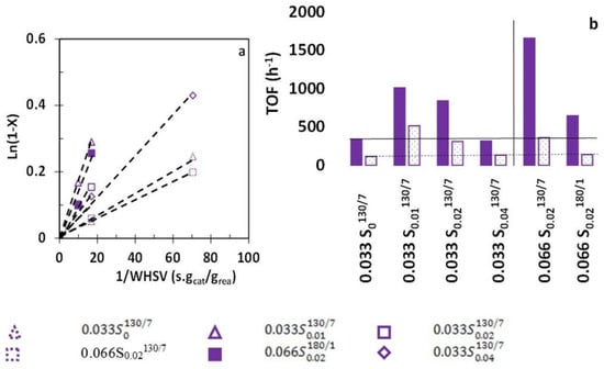 n-Hexane cracking is carried out at 540 °C at atmospheric pressure under nitrogen flow with a N2/n-hexane molar ratio of 9. Figure 6 displays Ln (1−X) as a function of 1/WHSV obtained after 1 min. Ln (1−X) vs. contact time gives a straight line through the origin, indicating a pseudo-apparent-first-order. This order is consistent with the n-monomolecular cracking mechanism.