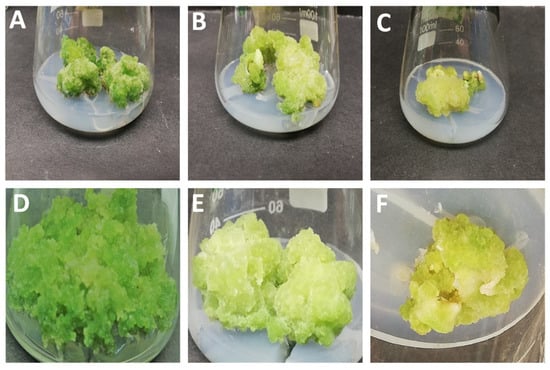 Morphological aspects of callus cultures of L. grandiflorum from stem explants (A) 1.0 mg/L NAA (B) 1.0 mg/L NAA + 2.5 mg/L TDZ (C) 2.5 mg/L TDZ, and from leaf explants (D) 1.0 mg/L NAA, (E) 1.0 mg/L NAA + 2.5 mg/L TDZ (F) 2.5 mg/L TDZ.