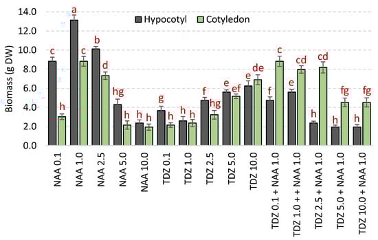 Comparison of biomass dry weight (DW) accumulation for hypocotyl- and cotyledon-derived callus cultures of L. grandiflorum grown on various plant growth regulators (PGRs; i.e., NAA and/or TDZ) treatments. NAA and TDZ concentrations are indicated in mg/L. Different letters indicate significant difference (p < 0.05).