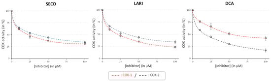 IC50 curves for the inhibition COXs by the lignans (SECO and LARI) and neolignan (DCA) accumulated in L. grandiflorum in vitro cultures.