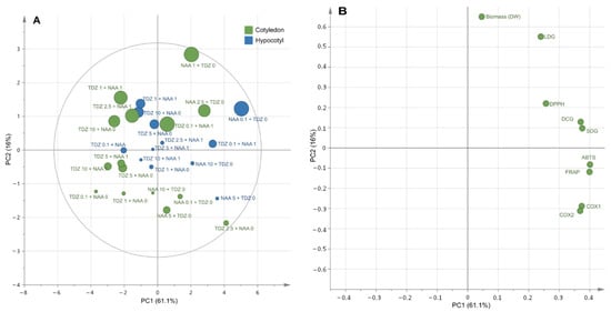 Principal component analysis (PCA) for the discrimination of the different L. grandiflorum extracts derived from callus cultures as a function of their phytochemical compositions and biological activities, with circle size relative to biomass, expressed as dry weight. Score plot (A); loading plot (B). Explained variance by factor 1 (PC1) = 61.1% and by factor 2 (PC2) = 16%.