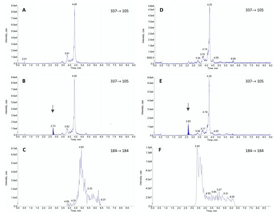 The representative chromatograms obtained during the validation of fentanyl (FEN). The blank sample (A), plasma sample containing FEN residues at the limit of quantification (B) and glycerophosphocholines (184 m/z) (C) are shown for standard rabbit plasma. For comparison the same chromatograms are presented for lipemic plasma, including blank sample (D), sample with FEN addition at the limit of quantification level (E) and glycerophosphocholines (F). The peak for FEN is seen as a dark-blue shaded area and it’s retention time is indicated by the arrows (ca. 2.6 min).