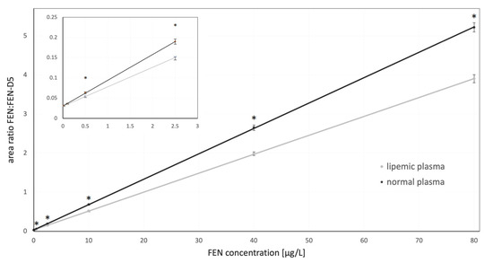 The difference between calibration curves in normal and lipemic plasma samples. The smaller panel represents the lower part of the calibration curves. Vertical bars represent standard deviations associated with the results. The significant differences between the area ratio observed in the two matrices are indicated by asterisks (p < 0.01).
