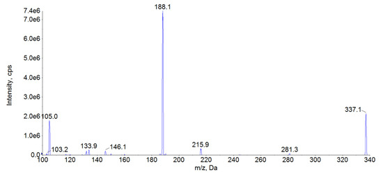 FEN is a synthetic compound belonging to the opioid group, frequently used as an analgesic agent [18]. It exerts an agonistic effect on opioid receptors [18]. The effective plasma concentration for this compound can be as low as 1.0 µg/L, which requires a very sensitive analytical method to adequately measure this drug concentration in the clinical conditions [26]. The most frequent methods used for FEN determination are those based on either liquid chromatography combined with UV-VIS detection [31,32,33,34] or liquid and gas chromatography combined with mass spectrometry [20,24,26,32,35,36,37,38,39,40,41,42,43]. Due to lower sensitivity and precision of UV-VIS detectors, this approach to the drug analysis is notably less frequent [42]. Sensitivity of gas chromatography methods combined with spectrometry is often excellent. However, this approach requires chemical derivatisation and is relatively time-consuming as compared with liquid chromatography [42]. Therefore, determination of FEN is dominated by liquid chromatography-mass spectrometry methods offering a convenient, sensitive and reliable analysis [20,24,26,32,35,36,37,38,39,40,42,44]. For liquid chromatography-mass spectrometry methods different authors consistently reported ESI as the best ionization mode [20,24,26,32,35,36,37,38,39,40,42,44]. Based on the literature data, we also decided to use it in our study. All parameters, namely declustering potential (DP), collision energy (CE), and entrance potential, were optimized with a direct infusion of working standard solution, as shown in Table 4. The ions selected for the analysis (Table 4) are in good accordance with those reported by other authors [20,26,32,35,36,37,38,39,40,42,44,45]. These ions were chosen based on the highest intensity, as indicated by mass spectra for FEN (Figure 3). Contrary to the other reports, we selected 105 m/z ion as a quantitative ion, despite its lower sensitivity. This choice was motivated by issues related to satisfactory signal linearity at higher concentrations for m/z 188 ion. The use of the ion with lower sensitivity allowed us to obtain adequate linearity at 80 μg/L. Unfortunately, despite our attempts, extending the method range to 100 μg/L was impossible, as in that case even the selection of the lower intensity ion did not provide satisfactory linearity. As the method was intended to be used during a pharmacokinetic experiment, the upper limit of 80 μg/L was concluded to be sufficient. Also, the obtained LOQ was fully satisfactory for this purpose. Therefore, to address both the necessity for low LOQ and the adequate upper limit of quantification, we selected 0.02–80 μg/L as a concentration range for our method.