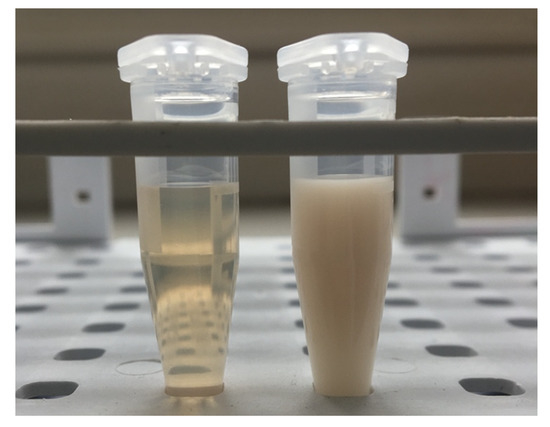 Apparent visual difference between the two matrixes used in the study, the normal rabbit plasma (on the left) and artificially produced lipemic samples obtained by Intralipid® addition to the normal plasma (on the right).
