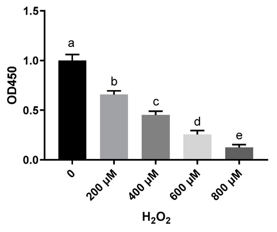 Hepatocytes’ survival rate detected by CCK-8 kit after being treated with 0, 200, 400, 600, and 800 μM H2O2. One-way ANOVA with Tukey’s test was applied. Data are expressed as mean ± SD; different letters indicate significant differences (p < 0.05).