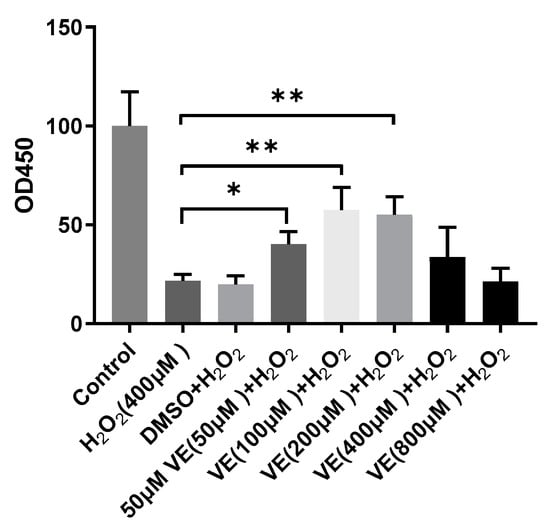 Hepatocytes’ survival rate detected by CCK-8 kit after being treated with 400 μM H2O2, with or without pretreatment of various concentrations of vitamin E(VE). One-way ANOVA with Tukey’s test was applied. Data are expressed as mean ± SD; the symbol * means p < 0.05, and ** means p < 0.01.