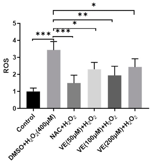 Hepatocytes’ survival rate detected by DCF-DA assay after being treated with 400 μM H2O2, with or without pretreatment of various concentrations of vitamin E or NAC. NAC was used as a positive control. One-way ANOVA with Tukey’s test was applied. Data are expressed as mean ± SD; the symbol * means p < 0.05, ** means p < 0.01, and *** means p < 0.001.