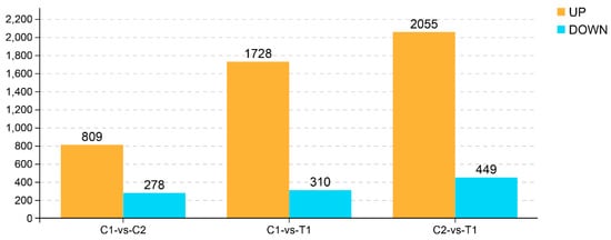 The fragments per kilobase of transcript per million mapped reads (FPKM) was used to determine the expression level of each gene. Differentially expressed genes (DEGs) were considered significant if the false discovery rate (FDR) was less than 0.05, and fold change was no less than 2. The number of significant DEGs among the three groups is shown in Figure 4. We identified 1087 significant DEGs between the C1 and C2 groups, of which 809 were upregulated and 278 were downregulated. A total of 2038 DEGs were identified between the C1 and T1 groups, and 1728 of these were upregulated and 310 were downregulated. Finally, a total of 2504 DEGs were identified between the C2 and T1 groups, 2055 of these were upregulated and 449 were downregulated.