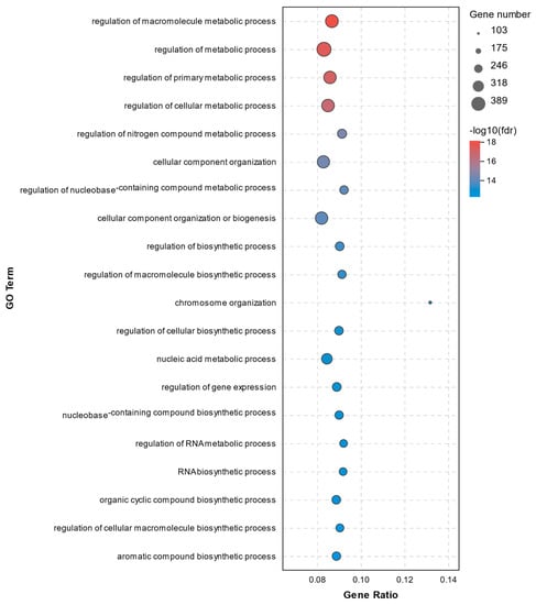 All DEGs were annotated according to three GO terms: biological process (BP), cellular component (CC), and molecular function (MF). A total of 494 significant enrichments between the C1 and C2 groups were observed with a p adjust-value of < 0.05 (Supplementary File S1). The top 20 GO terms for DEGs between the C1 and C2 groups are displayed in Figure 5. The data from the GO enrichment analysis indicated that the DEGs were mainly involved in metabolic processes and regulation, including regulation of macromolecule metabolic process, regulation of metabolic process, regulation of primary metabolic process, regulation of cellular metabolic process, and regulation of nitrogen compound metabolic process. Significant DEGs involved in these metabolic processes and regulation above were as follows: NLR family pyrin domain containing 3 (NLRP3, upregulated 12.15-fold), interleukin 1 beta (IL-1β, upregulated 2.41-fold), interleukin 1 receptor associated kinase 2 (IRAK2, upregulated 4.72-fold), caspase 8 (CASP8, upregulated 2.03-fold), caspase 8 associated protein 2 (CASP8AP2, upregulated 3.47-fold), receptor-interacting protein kinase 1 (RIPK1, upregulated 3.22-fold), toll like receptor 7 (TLR7, upregulated 5.50-fold), and prostaglandin-endoperoxide synthase 2 (PTGS2, upregulated 2.67-fold).
