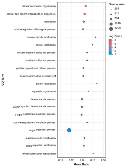 A total of 773 significant enrichments between the C1 and T1 groups were observed with a p adjust-value of < 0.05 (Supplementary File S2). The top 20 GO terms for DEGs between the C1 and T1 groups are shown in Figure 6. The GO analysis revealed that the cellular component organization, biogenesis and localization, and positive regulation of biological process were significantly enriched. Here, genes involved in processes above such as Prostaglandin-endoperoxide synthase 2 (PTGS2, upregulated 3.10-fold) and Transferrin receptor (TFRC, upregulated 7.96-fold) were worth mentioning. No significant differences were found in the abundance of NLRP3, IL-1β, IRAK2, CASP8, CASP8AP2, RIPK1, and TLR7.