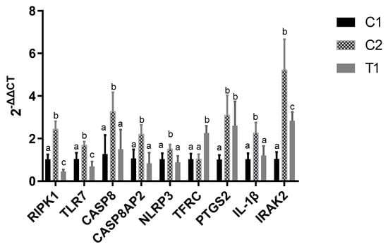 Relative expression of nine DEGs in the three groups. One-way ANOVA with Tukey’s test was applied. Data are expressed as mean ± SD. The same letter means no significant difference (p > 0.05), while different letters mean significant difference between groups (p < 0.05). C1 means control group, C2 means H2O2 treatment and T1 means vitamin E and H2O2 treatment. RIPK1, Receptor-Interacting Protein Kinase 1; TLR7, Toll Like Receptor 7; CASP8, caspase 8; CASP8AP2, Caspase 8 Associated Protein 2; NLRP3, NLR family pyrin domain containing 3; TFRC, Transferrin Receptor; PTGS2, Prostaglandin-Endoperoxide Synthase 2; IL-1β, Interleukin 1 Beta; IRAK2, Interleukin 1 Receptor Associated Kinase 2.