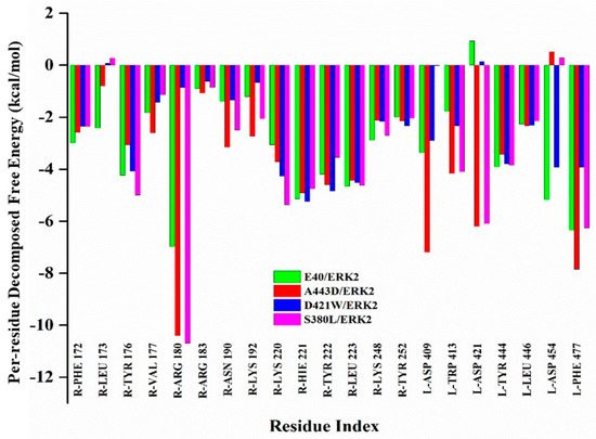 Figure 4 displays pairwise decomposition free energy for residues within 4 Å. The DARPin interacts with the receptor mainly through the activation loop, alpha G and MAPK insertion regions [61]. The receptor-ligand interactions are mainly through hydrogen bonds (details of the type of hydrogen bonds are presented in Table 4). For all the three mutants, the hotspot residues show interactions mostly through cation-Π and salt bridges. The two most remarkable salt bridge interactions occur between ARG180-ASP454 and LYS220-ASP409 (Figure 5). In the mutant A443D, salt bridges ARG180-HH12–ASP454-OD1 and LYS220-HZ1–ASP409-OD2 possess quite a low polar interaction energy—(−8.76 and −8.25 kcal/mol) and (−8.98 and −8.27 kcal/mol), respectively; hence the total binding free energy of these residue pairs. There is a remarkable decrease in the energy of LYS220-HZ1–ASP409-OD2 here compared to E40/ERK2. For the next mutant complex S380L/ERK2, the pairwise interaction of 4 Å residues is almost like that in the previous case A443D/ERK2. Here, the interactions between receptor and ligand are also through hydrogen bonds (Table 5) but differ in their energies, with two strong salt bridge interactions between ARG180-HH22–ASP454-OD1 (−8.30 kcal/mol) and LYS220 HZ2-ASP409 OD2. A noticeable drop is observed in the decomposition energy of the receptor-ligand pair LYS220–ASP409 (−11.45 kcal/mol). For the third mutant complex, D421W/ERK2 also follows a pattern similar to that of the pairwise interaction of 4 Å residues like that in the previous cases of A443D and S380L. As in the previous cases, the interactions occur between receptor and ligand through hydrogen bonds, but are not as strong as the previous mutations. Except for a strong salt bridge interaction between ARG180-HH22–ASP454-OD1 (−8.30 kcal/mol), all other interactions have lower ∆∆G values compared to the other two mutants, while salt bridge LYS220 HZ2-ASP409 OD2 shows a remarkable increase (positive) in ∆∆G values. The main polar receptor-ligand interactions of the mutant complexes are shown in Figure 6.