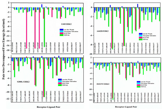 Comparison of pairwise decomposition free energy of complexes. Clockwise: E40/ERK2, A443D/ERK2, D421W/ERK2, and S380L/ERK2. Residues of receptor-ligand pairs and decomposition free energies in kcal/mol are shown on the X and Y axes, respectively. Contributions of van der Waals, non-polar solvation, polar, and total energies are shown with different colour bars.