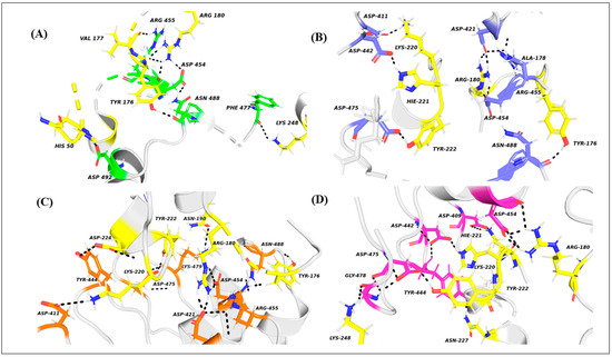 Polar contacts of the complexes of ERK2; residues shown in yellow with (A) E40 in green, (B) S380L in blue, (C) A443D in orange, and (D) D421W in pink. Polar interactions are shown by black dotted lines.