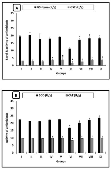 Liver antioxidant changes of mice after 2 weeks of treatment. (A) GSH levels and GST activity. (B) SOD and CAT activities. a significant difference from the saline group, b significant difference from the phosphate buffer group, c significant difference from the infected-untreated group. Groups I, II, III, IV, and VI presented saline, PB, PZQ, AL, and CU uninfected treated mice, groups VI, VII, VIII, and IX presented infected-untreated mice, and PZQ, AL, and CU presented treated mice.