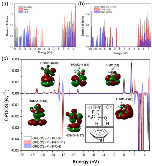 To evaluate the contribution of orbital overlap of the –OH group and –HFIPr group in the HFIP to the MO of benzene separately, partial orbital population DOS (POPDOS) was performed on the PhH/-HFIPr (Figure 2c, red area) and the PhH/-OH (Figure 2c, blue area) fragments. HOMO-5 shows bonding orbital overlap between PhH/-OH orbitals (blue), and antibonding between PhH/-HFIPr with a larger area. Therefore, the total OPDOS shows a negative value. However, even though the total OPDOS shows a negative value, the delocalization and constructive orbital overlap over PhH/-OH still contribute to lowering the electronic energy of MO [43,44] such as the energy change of HOMO-5 of the PhH/HFIP complex shown in Figure 2a. HOMO-6 shows the opposite results in the orbital overlap of PhH/-HFIPr and PhH/-OH to compared with HOMO-5. HOMO-24 and HOMO-1 also show positive values in the total OPDOS and POPDOS (PhH/-HFIPr), indicating the constructive orbital interaction. The LUMO and LUMO+2 also show strong positive values in OPDOS.
