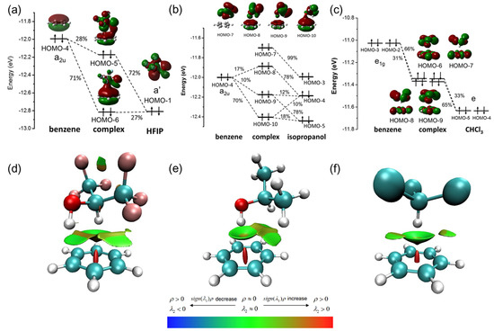 The reduced density gradient (RDG) is introduced to visualize the intermolecular interaction between complexes (Figure 3d–f) with VMD [33]. In Figure 3d, the interaction of O-H of HFIP with benzene shows the green disk-shaped isosurface, and the interaction of C-H of HFIP with benzene shows the green bowl-shaped isosurface. It indicates that the interaction between HFIP and benzene is close to van der Waals force, and the observed isosurface supports the existence of a dual XH–π interaction between HFIP and benzene. In Figure 3e, a green bowl-shaped isosurface at the front of O-H of IP shows van der Waals interaction, and a brown isosurface between C-H of IP and benzene shows repulsion interaction. In Figure 3f, a green bowl-shaped isosurface between CHCl3 and benzene shows van der Waals forces.