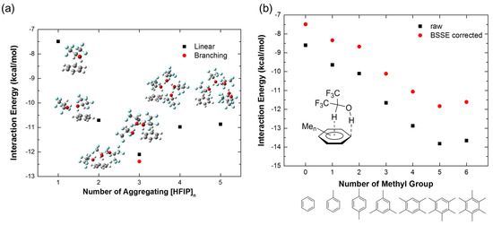 In addition, the aggregation effect of [HFIP]n is also considered in the calculation of interaction energies of HFIP with benzene. The interaction energies of different numbers of aggregating [HFIP]n (n = 1–5) with benzene are shown in Figure 4a. The interaction energy of three HFIPs in the branched structure with a benzene molecule shows the strongest interaction (−12.39 kcal/mol) to compare with the linear connected HFIP (−12.10 kcal/mol), and other aggregating numbers. The interaction energies of benzene with two, four, and five HFIP molecules are near to −11 kcal/mol with 0.2 kcal/mol differences. Therefore, two molecules of HFIP are sufficient to describe the enhancement of interaction energy with benzene caused by the aggregating effect of [HFIP]n. Moreover, the delocalization of orbitals of benzene to [HFIP]n molecules significantly lowers the orbital energy levels of benzene, as shown in the CDA diagram (n = 2–5 in Figures S1–S5, in Supplementary Materials), which also shows [HFIP]n are involved in the hybridization of MOs of complexes of [HFIP]n/PhH. Highly delocalized molecular orbitals are observed in the aggregating model, as shown in Figures S6–S11.