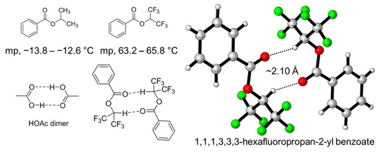 On the other hand, single-crystal X-ray diffraction is the most straight forward and important technique in the structural determination of crystalline materials for understanding their structure–property relationships. The XH–π interaction between HFIP and arenes can be found in many reported crystal structures. For example, Halmiton et al. reported the crystal structures containing macrocyclics and HFIP, and a very short distance of CH–π between HFIP and the arene in macrocyclics can be found (2.28–2.28 Å) [49]. To experimentally observe the hydrogen-bond-donating property of the C-H bond in HFIP without the influence of the O-H bond, the benzoyl group was introduced to mask the O-H group in HFIP, and the corresponding ester, 1,1,1,3,3,3-hexaflurorisopropyl benzoate (HFIPBz), was prepared. Surprisingly, HFIPBz shows a greatly higher melting point (63.2–65.8 °C), compared to its analogue of isopropyl benzoate (IPBz) (−13.8–−12.6 °C). The unexpected high melting point apparently indicates the strong interaction among of HFIPBz with the high degree of molecular orientation due to the hydrogen bonding, resulting in the formation of HFIPBz dimer, as shown in Figure 5 [50]. The hydrogen bond between C-H of one hexafluoroisopropyl group and oxygen atom of carbonyl group in another HFIPBz is shown to be 2.10 Å.