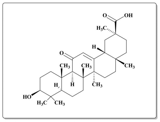Licorice root is a medicinal plant. It contains many phytochemicals including more than 300 flavonoids and 20 triterpenoids. The active ingredients, glycyrrhizic acid (GL), glabrin A and B, 18 β-glycyrrhetinic acid (GA, the major metabolite of GL) (Figure 1), isoflavones, and others produce different pharmacological activities. Glycyrrhizin, an abundant bioactive component, is promptly metabolized into 18 β-glycyrrhetinic acid by the gut commensal bacteria [15]. GL and GA are kinds of pentacyclic triterpenoids, having many valuable pharmacological properties, such as antioxidant properties as well as potent anti-inflammatory, antiviral, antitumor, and immune-regulatory properties [15,16,17,18,19,20].