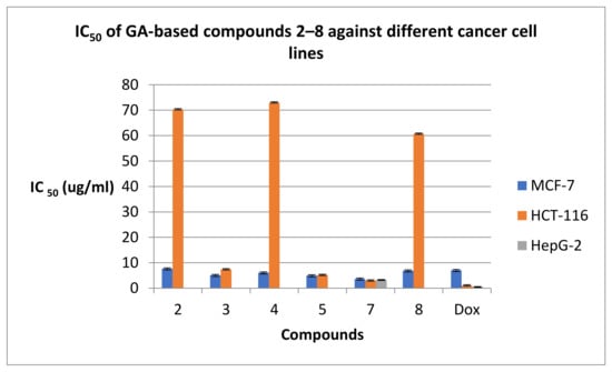 The promising compounds that exhibited percentage of inhibition ≥70% were further subjected to MTT assay for investigation of their IC50 (median growth inhibitory concentration necessary to inhibit the cell viability by 50%) [34,35,36] and doxorubicin served as a reference. Accordingly, all the newly synthesized GA-based peptides except 1 and 6 were screened for their cytotoxicity against three different human cancer cell lines: MCF-7, HCT-116, and HepG-2 cell lines at different concentrations (10, 5, 2.5, 1.25, and 0.625 µg/mL). The resultant data were expressed as half maximal inhibitory concentration IC50 (μg/mL) and summarized in Table 1.