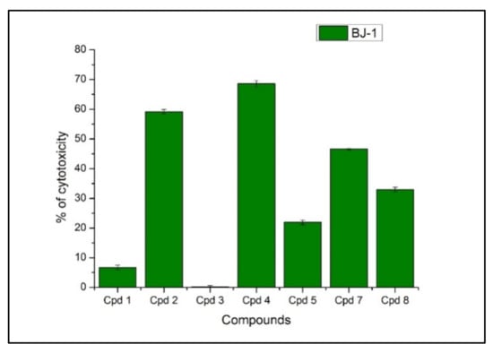 The frequency and severity of side effects to normal cells at therapeutic levels is one of the most critical factors that distinguish different anticancer drugs from each other. Accordingly, the GA peptides 1–8 were furthermore screened for their cytotoxicity at 10 µg/mL against the human normal skin fibroblasts cell line BJ-1 to determine their safety upon normal cells (Figure 4). The compounds 1, 3, and 5 exhibited minor cytotoxic effects of 7%, 2%, and 20% on the examined normal cells compared to the other compounds. According to our safety study on BJ-1, compound 5 was chosen from among compounds 1 and 3 due to its remarkable selective anti-breast carcinoma cells in a dose-dependent manner with the least IC50 = 5 ug/mL without affecting normal healthy cells, which makes compound 5 an interesting GA peptide for further biological evaluation.