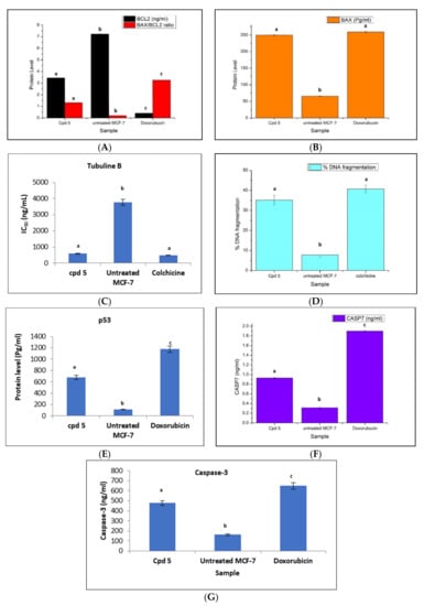 Quantitative assessment (mean ± SD) protein levels of (A) Bax/BCL-2 ratio, (A) Bcl-2 (ng/mL), (B) Bax (Pg/mL), (C) IC50 (ng/mL) on tubuline B, (D) % DNA fragmentation, (E) p53 (Pg/mL), (F) caspase-7(ng/mL) and (G) caspase-3(ng/mL) for compound 5, each value is the mean of three replicates, SD = standard deviation. Statistical analysis was done using one-way analysis of variance (ANOVA) using the CoStat computer program accompanied by the least significant level (LSD) between groups at p < 0.05. Unshared letters (a, b, and c) are significant values between groups for each parameter at p < 0.0001.
