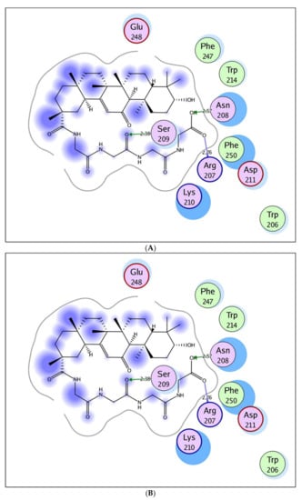 The docking of compound 5 within the ATP-pocket of caspase-3 is depicted in Figure 6. It could be seen that the two oxygens of the terminal carboxylic group interacted with the backbone of Arg207 and the side chain of Asn208 and generated two hydrogen bonds (distance: 2.76 and 2.57 Å, respectively). Additionally, the amide oxygen formed the H-bond acceptor with the side chain of Ser209 (distance: 2.38 Å). The whole compound was enclosed within the active site through hydrophobic interactions with the essential amino acids Trp206, Lys210, Asp211, Trp214, Glu248, and Phe250.