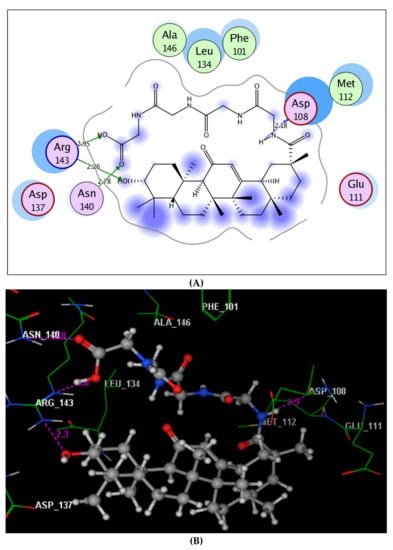 The anticancer activity of GA has been extensively studied against different cancer types, such as breast cancer, ovarian cancer, promyelocytic leukemia, hepatoma, and stomach cancer cells [21]. It has been investigated that GA can produce the cytotoxic effect via various modes of action, such as disruption of actin cytoskeleton, suppression of the p38 MAPK-AP1 signaling axis in addition to induction of Fas- or DNA fragmentation-mediated apoptosis [22,23,24,25]. Fortunately, the studies represented the safety profile of GA, since it produces selective cytotoxicity against tumor cells without any undesirable side effects on normal cells in addition to its potent anticancer effect higher than some clinically available antitumor drugs [21]. However, due to the high hydrophobicity and poor blood serum solubilization of the pentacyclic triterpenoids, GA use as a cytotoxic medicine in the treatment of cancer disease is limited. Up until now, numerous studies were directed to structural modifications to enhance GA bioavailability, selectively, and cytotoxicity [26,27,28,29,30]. Amino acids are the primary substance, which support biological life activities, producing very important roles. They are highly soluble in water having a wide spectrum of pharmacological activities including antitumor activity [31]. It has been reported that conjugation of pentacyclic triterpenoids with various amino acid residues can modify their shortcomings resulting in enhancing their physicochemical characteristics and ADME properties. Therefore, they have been considered as the preferred natural product structural modifiers [32].