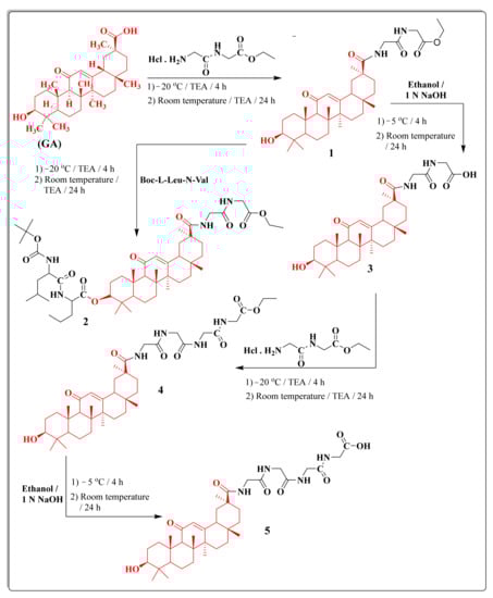 Condensation of 18β-glycyrrhetinic acid with ethyl glycylglycinate hydrochloride afforded the corresponding ester derivative 1. The reaction of compound 1 with Boc-l-Leu-N-Val yielded the derivative 2, while the hydrolysis with methanolic sodium hydroxide produced the acid derivative 3. In addition, condensation of acid derivative 3 with ethyl glycylglycinate hydrochloride afforded compound 4. Additionally, hydrolysis of compound 4 with methanolic sodium hydroxide produced compound 5 (Scheme 1). The structures of the new compounds were confirmed depending upon microanalytical and spectral data. IR spectra of the new compound 1 revealed well-defined bands at 1752 cm−1 referring to (C=O ester), 1659, 1535, and 1457 cm−1 referring to three (C=O) groups, respectively. Furthermore, 1H NMR spectrum of 1 represented the characteristic triplet-quartet signals of the ethyl group at δ 1.40 and 4.33 ppm. 1H NMR spectrum of 2 showed characteristic singlet signals at δ 9.04, 9.00, 8.45, and 7.55 ppm due to four CONH amide protons, a quartet signal at δ 1.90 ppm due to CH2CH2CHofL-Nva. Moreover, 1H NMR spectrum of 2 revealed the presence of two triplets at δ 1.80 and 1.50 ppm related to the CH and CH2of Leu. IR spectrum of the compound 3 showed strong absorption bands at 3610 and 3509 cm−1 referring to OH primary cyclic alcohol and OH acid.