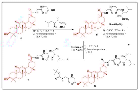 One of our goals was increasing the activity of GA by “simple” transformation but retaining the advantages residing in the parent compound GA. Thus, this study aims to conjugate 18β-glycyrrhetinic acid with different amino acids to gain new peptide candidates 1–8. The synthetic approaches of construction of the eight novel peptides 1–8 are illustrated in Scheme 1. The acid 18β-glycyrrhetinic acid was coupled with various amino acids utilizing conventional synthetic peptide coupling methods (in solution) [48].