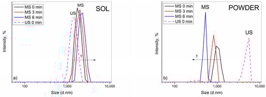 However, it is obvious that MS was less efficient than US agitation, with regard to the stability imparted to the bath (Figure 1 dash lines). In the sol-containing bath, particles were of bigger diameters when subjected to MS compared to those measured after US (Figure 1a). The same conclusion stands for the powder-containing bath (Figure 1b). Application of US provided more efficient particle de-agglomeration, resulting in formation of similarly sized aggregates in the bath. The most abundant size population was at 4979 nm (94.9%), which reflected the measured Zav (4931 nm) well, pointing to the relative homogeneity and stability of the bath. Unlike after MS, where the particles aggregated and settled quickly, as already discussed, and only small-sized ones remained in the bath (Figure 2).