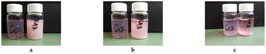 Visual observation of ceria sol (bottles on the left) and ceria powder-containing (bottles on the right) electrolytic baths after magnetic stirring: (a) 0 min, (b) 3 min, and (c) 6 min.