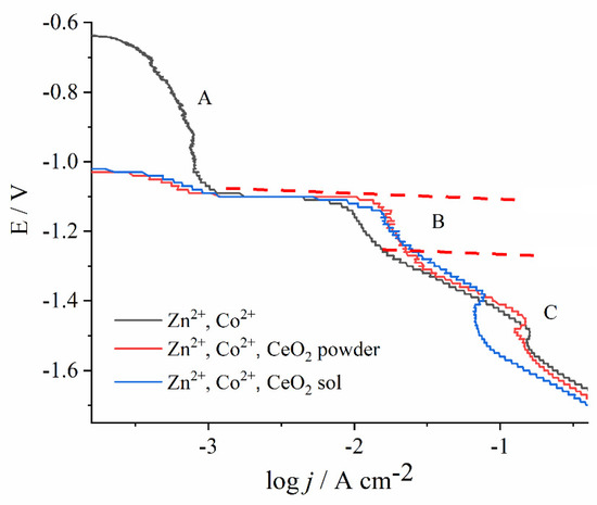 At the onset of region B, the sharp rise in current density denotes the Zn2+ electroreduction, coupled with the still suppressed Co2+ reduction. Therefore, in this region, the anomalous co-deposition occurs. According to the widely accepted theory, Zn2+ has significantly faster electrodeposition kinetics than Co2+, and, thus, it deposits preferentially, resulting in a higher Zn percentage in the alloy [31,33,34]. Interestingly, the current density in this region is higher regardless of the ceria source, as the Ce species are electrochemically inert particles that usually suppress the rate of electrochemical reactions due to surface blocking [35]. A depolarization effect of ceramic particles was observed earlier, for example, in the electrodeposition of Co–Ni-Al2O3 [36] or Ni-SiC composites [37]. The most likely explanation for this anomaly is that some amount of metal ions is adsorbed at the oxide particles, and their mass transport is enhanced as compared to the diffusion of non-adsorbed metal ions [36]. The other plausible explanation can be the fact that the freshly deposited composite coating is of higher roughness as compared to the fresh Zn-Co deposit obtained during the polarization; it has a higher surface area, and, thus, a higher current is measured.
