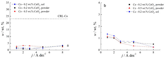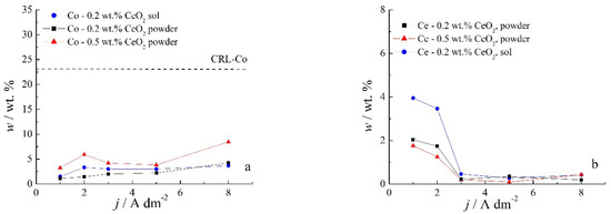 Dependence of the (a) Co and (b) Ce contents in Zn-Co-CeO2 coatings on the deposition current density for coatings deposited under ultrasound from the solutions with different sources and amounts of CeO2 particles.