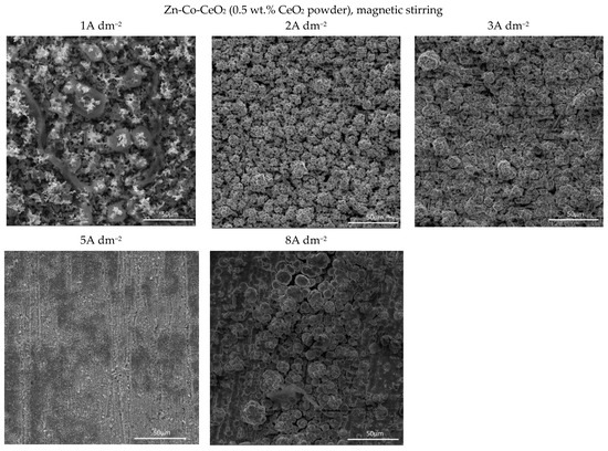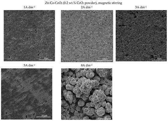 Several features could be inferred from Figure 4. The amounts of both Co and Ce are small, as expected based on the low contents of the CeO2 and Co ions in the plating solution. Still, a slight positive trend in Co content at a higher deposition current density could be observed for all plating solutions. Concurrently (Figure 4b), the rise in the deposition current density resulted in a decrease in the Ce content in the deposit, which is not an unusual phenomenon in the electrodeposition of composite coatings [18,39]. The smaller current densities 1 and 2 A dm−2 were beneficial for the particle content. Increasing particle concentration in the plating bath (0.5 wt.% CeO2 powder) did not cause arise in particle content in the deposit. However, home-made ceria sol favored the incorporation of particles in the Zn-Co matrix. The increase in current density caused the increase in the electrodeposition rate, whereas particles, mainly transported toward the cathode by agitation of the solution, did not have enough time to get trapped in the growing layer. The change in the concentration of the ceria powder in the plating solution from 0.2 to 0.5 wt.% was not beneficial to particle co-deposition due to the agglomeration of ceria particles [20], as large agglomerates tend to collide with the cathode surface or need a higher residence time to be incorporated into the growing layer. The slight rise in cerium content in the composite coating when ceria sol was used can be related to the smaller size of the particles that are uniformly distributed in the plating solution; therefore, the greater number of particles could have been trapped by the growing metallic matrix. Still, all composite coatings deposited anomalously since the Co content in the coatings was considerably below the compositional reference line (CRL), defined by Brenner [34] as the ratio of Co2+ to the total amount of metal cations (Co2+ and Zn2+) in the plating solution. The morphology of the electrodeposited composite coatings is shown in Figure 5, Figure 6 and Figure 7.