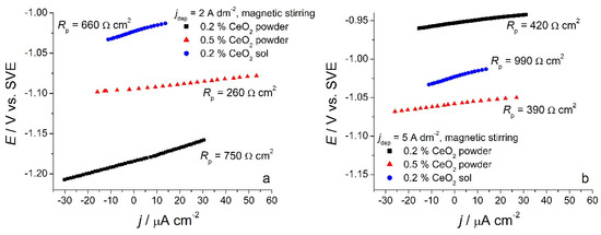 Linear polarization measurements, as a fast method for determining polarization resistance, were used for preliminary tests of corrosion behavior of composite coatings. Samples deposited under magnetic stirring from the solutions containing 0.2 wt.% or 0.5 wt.% CeO2 powder were analyzed, as well as the ones deposited from the solution containing 0.2 wt.% CeO2 sol. Polarization resistance values (Rp) were determined from the slope of the dE–dj curve (Figure 8) at the open circuit potential, and the results are presented in Table 1.