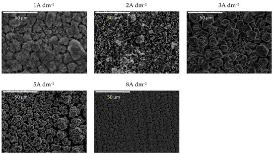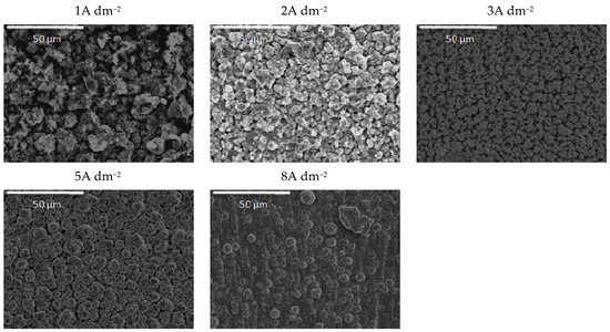 The increase in bath loading resulted in deterioration of the surface compactness and homogeneity. The surface appearance of these coatings (Figure 6) was changed as compared to those observed at a lower amount of particles (Figure 5). The morphology of the composite coating obtained at the smallest current density examined was quite heterogeneous. Irregularly distributed large zinc pallets surrounded by smaller snowflake-like structures were visible on the coating surface. The shift in current density to 2 and 3 A dm−2 resulted in a more homogeneous surface finish compared to 1 A dm−2, although with clearly visible porosity. The further shift in current density to 5 A dm−2 resulted in grain size refinement. The similarity in appearance of this coating with the morphology of the composite coating deposited under the same current density, but with lower bath loading, is obvious (Figure 5). The furrows of voids are visible in both composite coatings deposited at 5 A dm−2 (Figure 5 and Figure 6) probably as a result of an intense gas evolution from the surface, pointing out that at 5 A dm−2, the hydrogen evolution is significant during the electrodeposition process. The nodular structures are much bigger, appearing even on the coatings deposited at smaller current densities (2 A dm−2) when the bath loading is increased, which was not noticed for the coating morphology when a lower particle content was used (Figure 5). This kind of behavior suggests that the electric field was non-uniformly distributed during the electrodeposition from the solution containing 0.5 wt.% ceria powder.